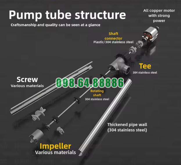 Máy sử dụng ống bơm và trục quay inox 304, kết hợp với cánh bơm inox SUS304 nguyên khối, giúp tăng độ bền khi bơm nhựa đường và các chất lỏng đặc. Kết cấu này phù hợp với môi trường làm việc có tải nặng, áp lực lớn và yêu cầu vận hành ổn định.