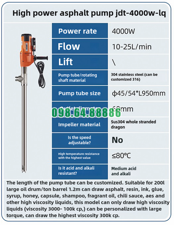 Bơm điện hút chất đặc từ thùng phuy JDT-4000W-LQ là thiết bị rất phù hợp cho ngành nhựa đường nhờ được thiết kế chuyên dùng cho chất lỏng có độ nhớt cao. Với công suất lớn 4000W, kết cấu bền chắc và khả năng làm việc với nhựa đường nóng trong giới hạn cho phép, dòng bơm này đáp ứng tốt nhiều nhu cầu thực tế trong quá trình sang chiết và thi công.