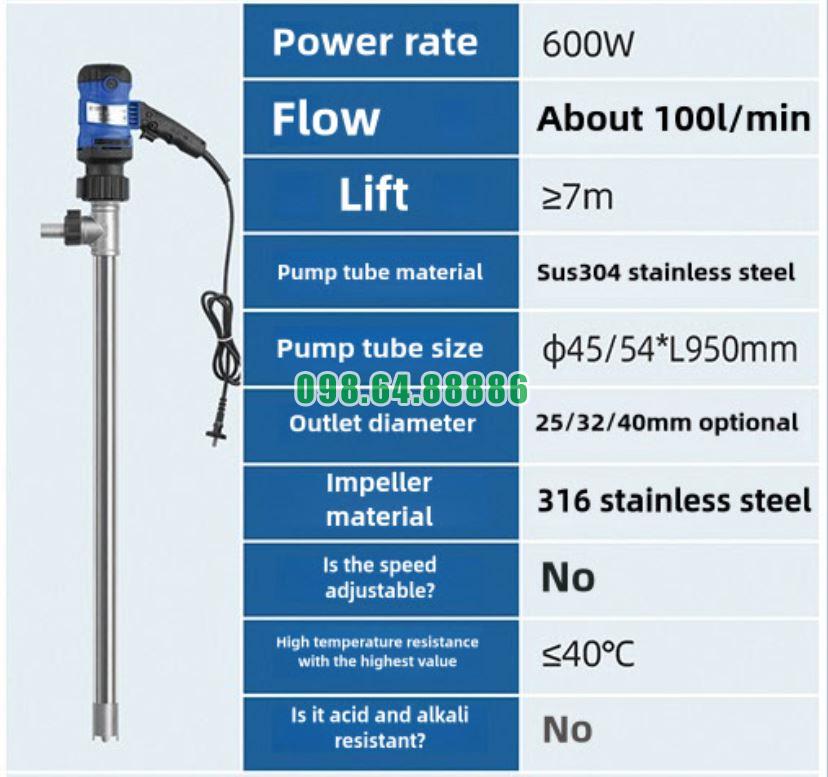 Bơm thùng phuy không kháng axit-kiềm model JDT-600W-304SUS