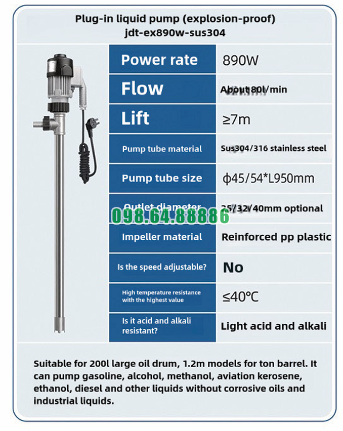 Đặc biệt quan trọng khi Máy bơm chất lỏng cắm trực tiếp chống cháy nổ JDT-EX890W-SUS304 được sử dụng với nhiều loại dung dịch khác nhau.